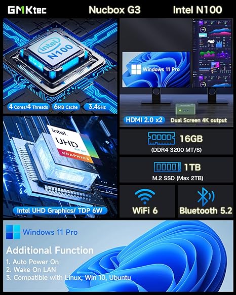 GMKtec Mini PC, Intel N100 Windows 11 Pro (3.4GHz), 16GB DDR4 1TB PCIe M.2 NVMe SSD, Desktop Computer 4K Dual HDMI Display/4x USB3.2/WiFi 6/BT5.2/RJ45 Ethernet Nucbox G3