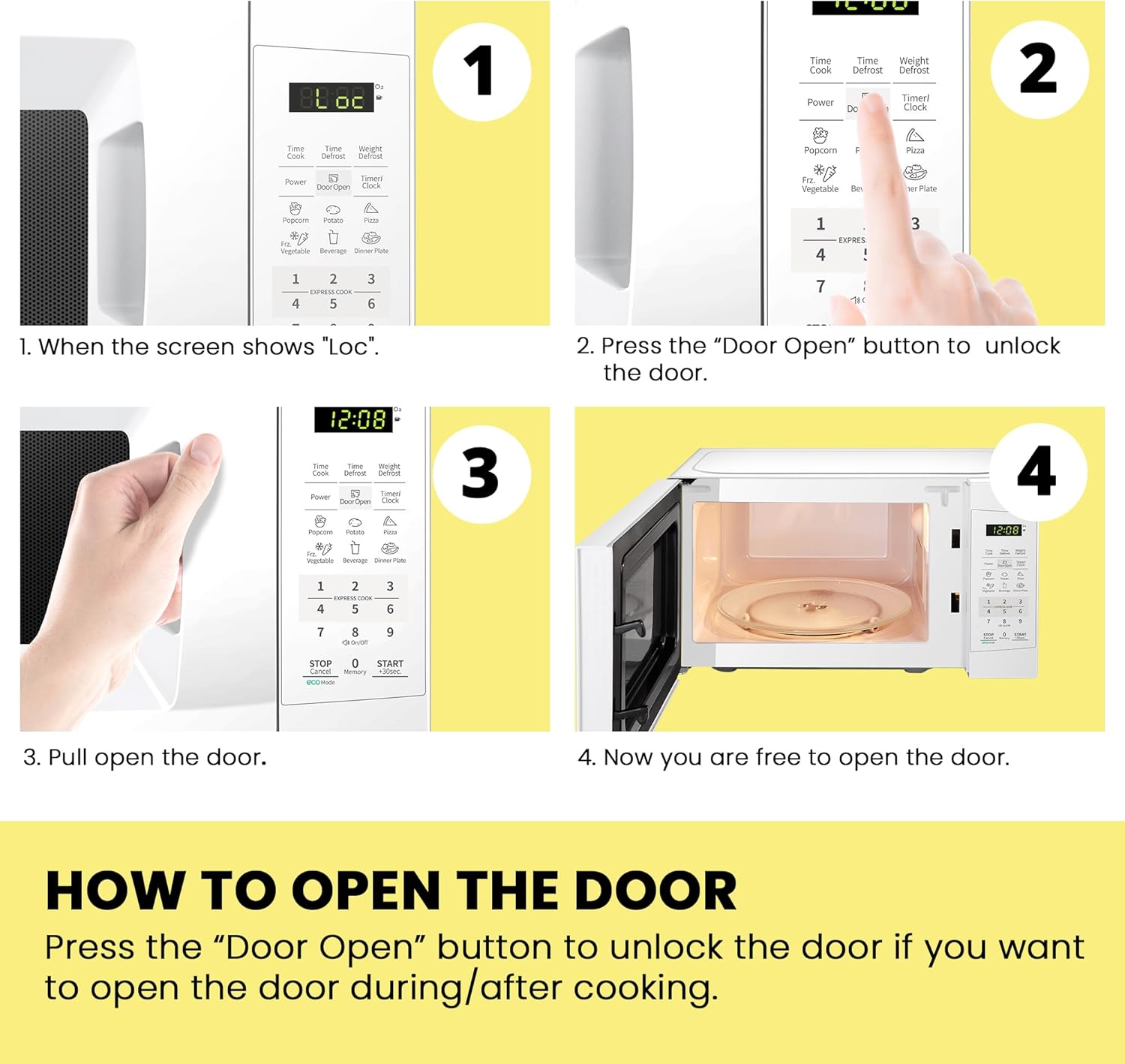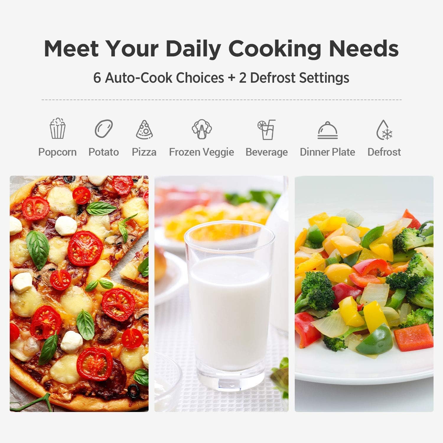 • Mute function, settings, clock, kitchen timer, child safety lock, easy auto-cook functions: Popcorn, potato, pizza, frozen veggie, beverage, reheat