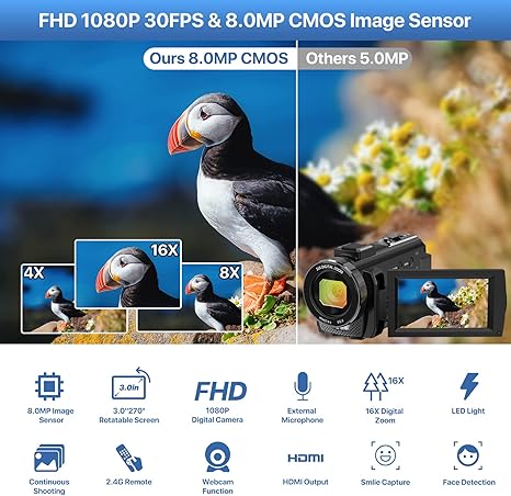 • Video Camera Camcorder: With 8 mega pixel CMOS image sensor it records 30fps movies in 1080p and 60fps in 720p resolution. You can capture vibrant and extremely realistic images; Ideal choice for amateurs and beginners to take selfies and start filming.