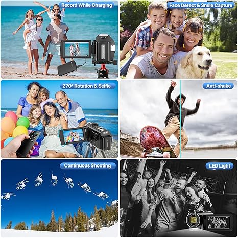 • Multifunctional Camcorder: The camcorder supports face detect, smile capture, anti shake, data stamp, playback modes, TV output, and pause function etc. With the pause function, you can pause the video when you need to convert the scene without reopening a new file, which makes it easier for you to upload and edit your videos.