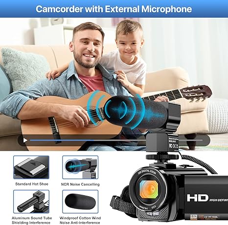• Camcorder with Microphone and Remote: This camcorder has built-in and external microphone. The external microphone enhances sound recording volume and reduces noise. It comes with a remote control,no one will miss any precious moment.